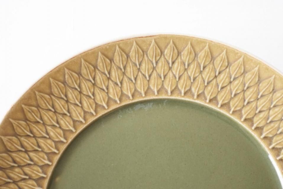 しっとりとしたカフェオレ色の釉薬の濃淡によって、規則正しく並ぶ葉っぱが表現され、見るほどに味わいを増してゆきます。